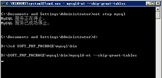 linux/win重置mysql的root密码Windows环境的找回方法: 1、打开cmd命令窗口,先输入命令: net stop mysql 回车 #关闭mysql服务。 进入到D:\SOFT_PHP_PACKAGE\mysql\bin\ 目录下,执行mysqld --skip-grant-tables 启动MySQL Server (如果报错,执行mysqld-nt --skip-grant-tables)如图: