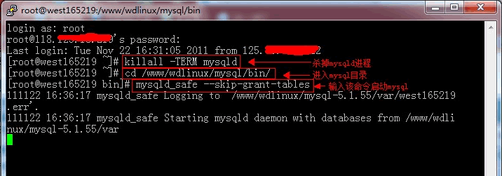 linux环境的找回方法: 1、ssh登陆到linux服务器,向mysqld server 发送kill命令关掉mysqld server(不是 kill -9),存放进程ID的文件通常在mysql的数据库所在的目录中。(命令输入部分用红色标注) #cd /www/wdlinux/mysql/bin/ #mysqld_safe --skip-grant-tables 启动后的状态,如图: