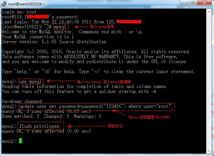 3、 原有的ssh客户端不要关闭(若该客户端超时,可能导致重置密码失败,所以重置密码过程建议在几分钟内完成),新开一个ssh客户端登陆,登陆后输入mysql命令登陆到mysql: >mysql 然后输入以下命令重置密码: 如图: 4、输入命令: #killall -TERM mysqld 5、用新密码登陆试试